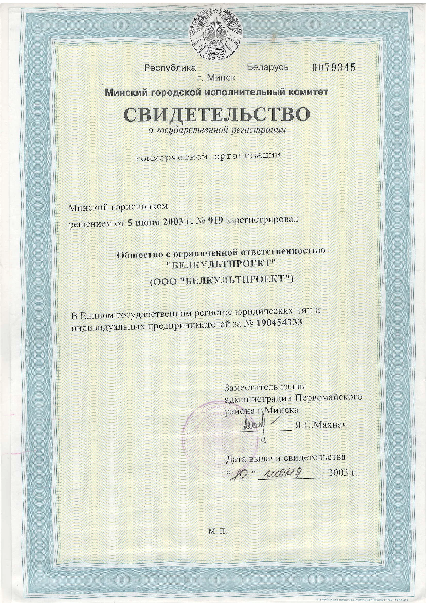 Полное наименование: Общество с ограниченной ответственностью «БелКультПроект»